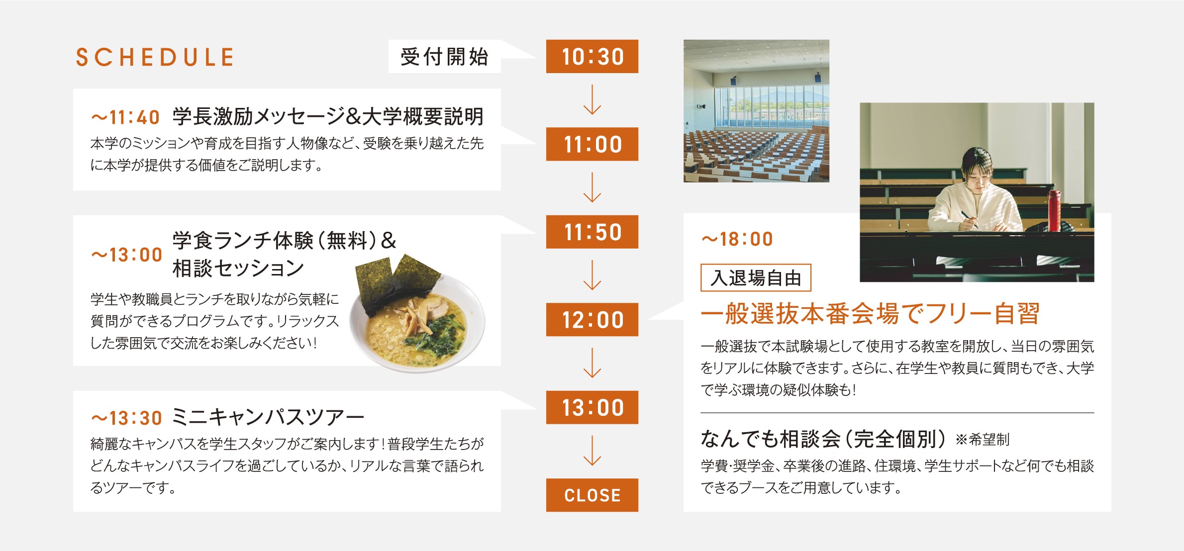 高校3年生&保護者限定イベント「受験生エンパワーDAY」を開催します。普段は入ることのできない「一般選抜本番の試験会場」を自習スペースとして開放し、ミニキャンパスツアーを実施。さらに、学食の無料体験や完全個別の相談会(希望制)もご用意しています。