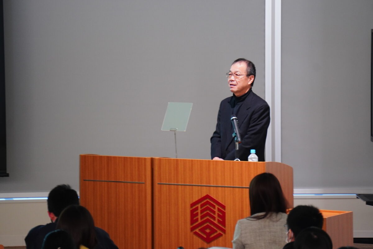 今回は2年生の「プロジェクト演習Ⅳ」の講義の一環として行われ、学生も聴講しました。