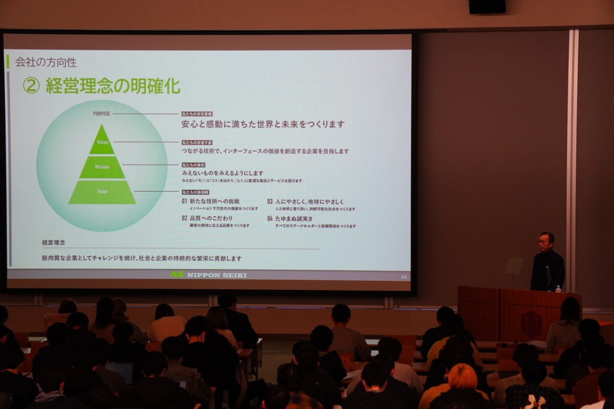 「安心と感動に満ちた世界と未来をつくる」をパーパスとして掲げる同社。かつて大雪で列車が止まった際にはソリに製品を載せて運んだエピソードなども交えながら、ステークホルダーに信頼される品質を追求し続ける大切さを伝え、講演の最後は「長岡は(三条の)隣ですから応援していますので、皆さんも特に地元の企業を応援してください」と学生に対してエールを送ってくださいました。